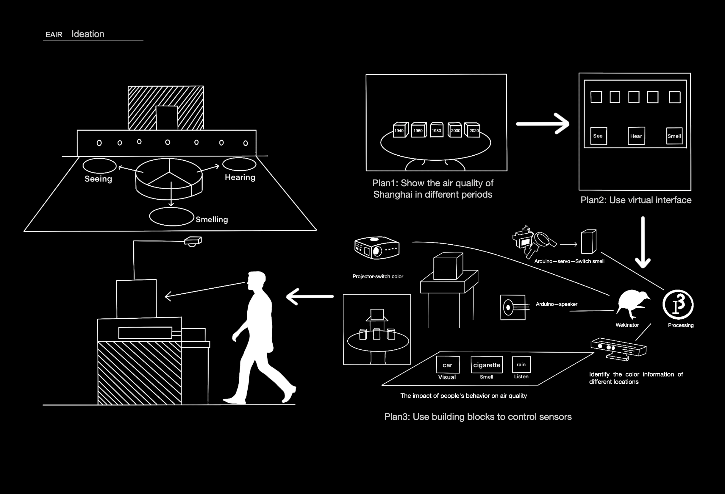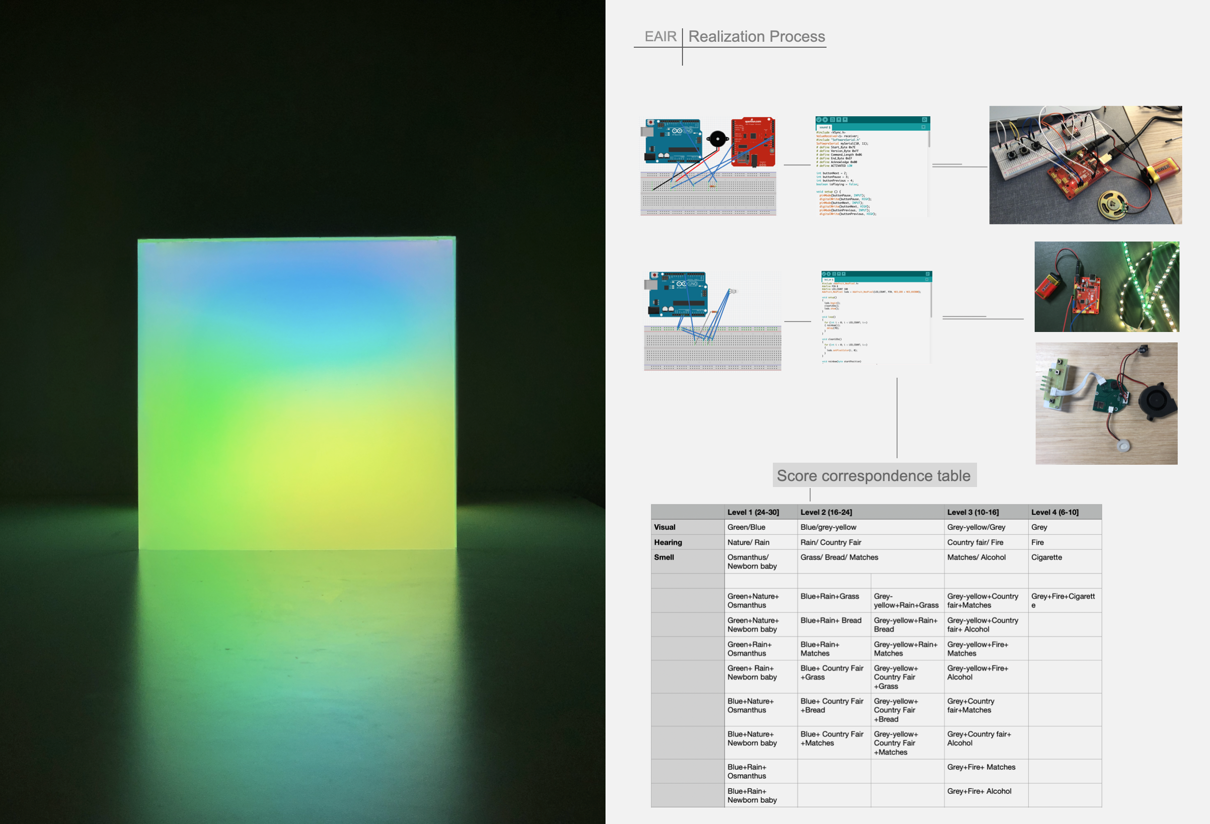 The audience can select the blocks with different symbols and put them together to get the corresponding air index, which will be transformed by installation into three intense sensory experiences: seeing, hearing and smelling.